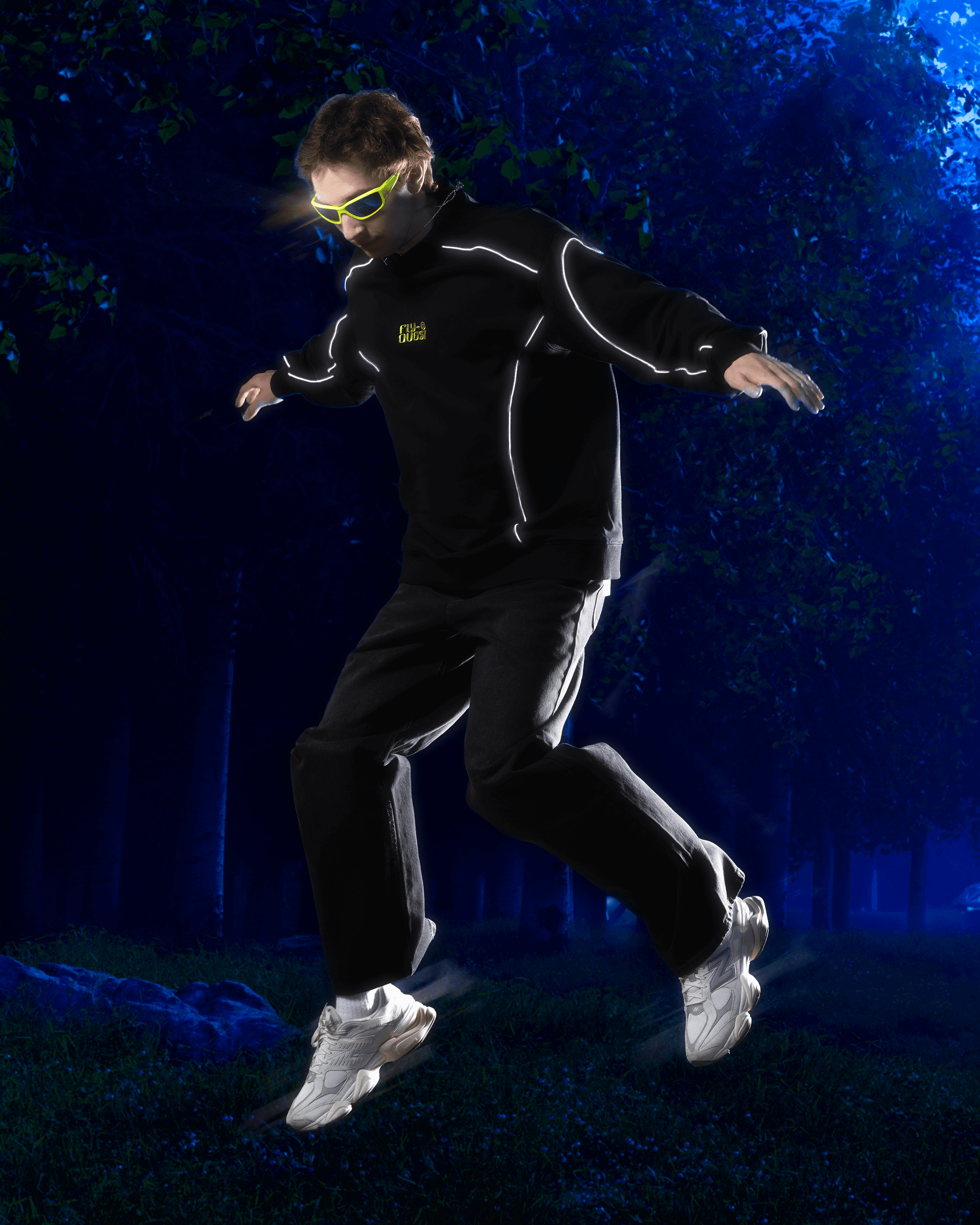 After sampling and manufacturing, we directed two separate shoots - day & night - to capture how the apparel would change depending on its environment.